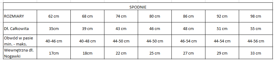 Rozmiar 62 cm, Rozmiar 68 cm, Rozmiar 74 cm, Rozmiar 86 cm, Rozmiar 92 cm, Rozmiar 98 cm
