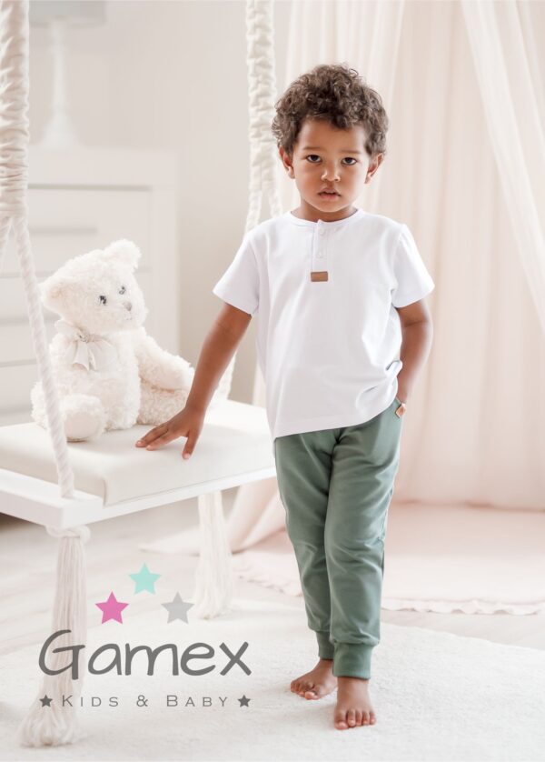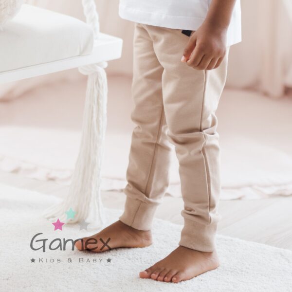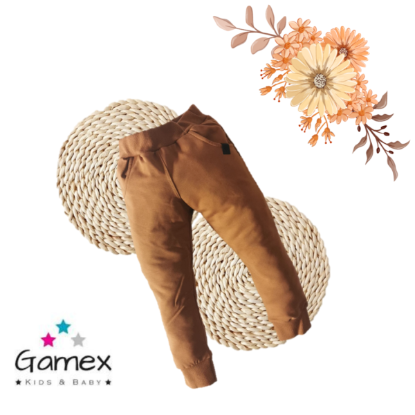 Miękkie i wygodne spodnie dla chłopca w kolorze karmelu. Wykonane przez polskiego producenta Gamex. Skład materiału: 95% bawełna oraz 5% elastan. Dodatek elastanu wpływa na wygodę noszenia, dlatego spodnie nie uciskają maluszka.