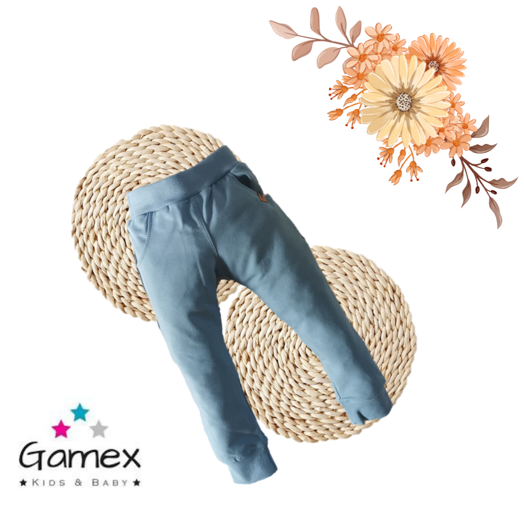 Miękkie i wygodne spodnie dla chłopca w kolorze niebieskim. Wykonane przez polskiego producenta Gamex. Skład materiału: 95% bawełna oraz 5% elastan. Dodatek elastanu wpływa na wygodę noszenia, dlatego spodnie nie uciskają maluszka.