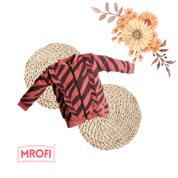 Bluza z falbanką z motywem zwierzęcym. Zakończenie zamka jest bezpieczne dla dziecka i zapobiega uszczypnięciu. Skład materiału: 95% bawełna oraz 5% elastan. Polski producent Mrofi. .