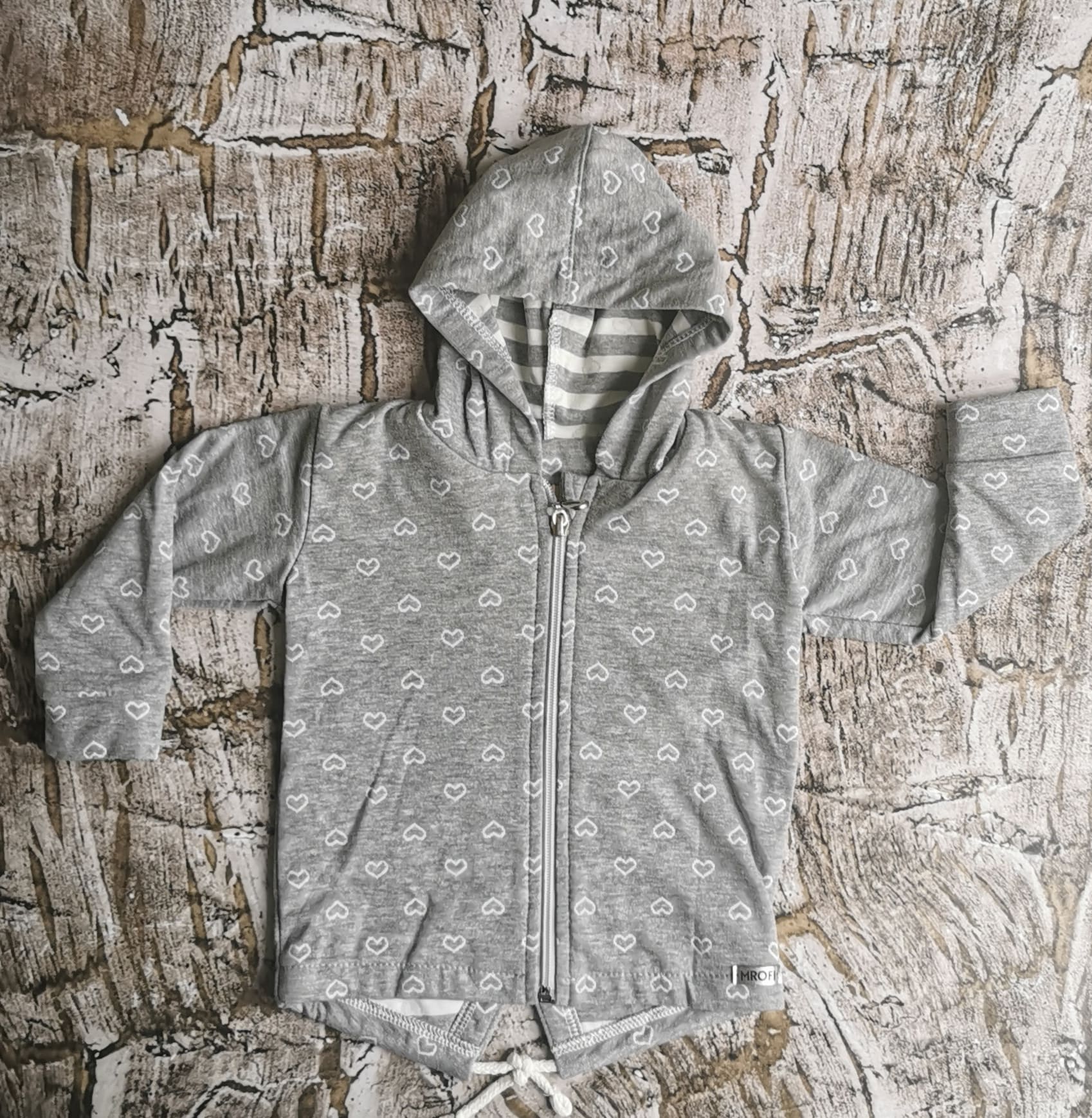 Bardzo wygodna bluza z motywem serduszek i kapturem. Zapinana na zamek błyskawiczny (bezpieczny dla dziecka) .Skład materiału to 95 % bawełna, 5% poliester Polski producent Mrofi.