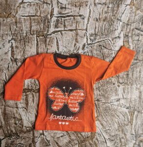 Pomarańczowa bluzka z motywem motylka. Skład materiału to 95 % bawełna, 5% elastan. Polski producent Mrofi.