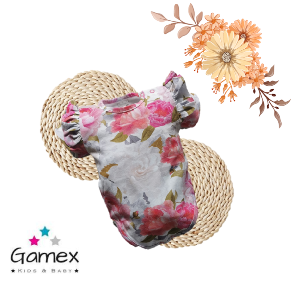 Body z motywem kolorowych kwiatów i falbankami na rękawkach . Skład: 95% bawełna , 5% elastan. Polski producent Gamex.