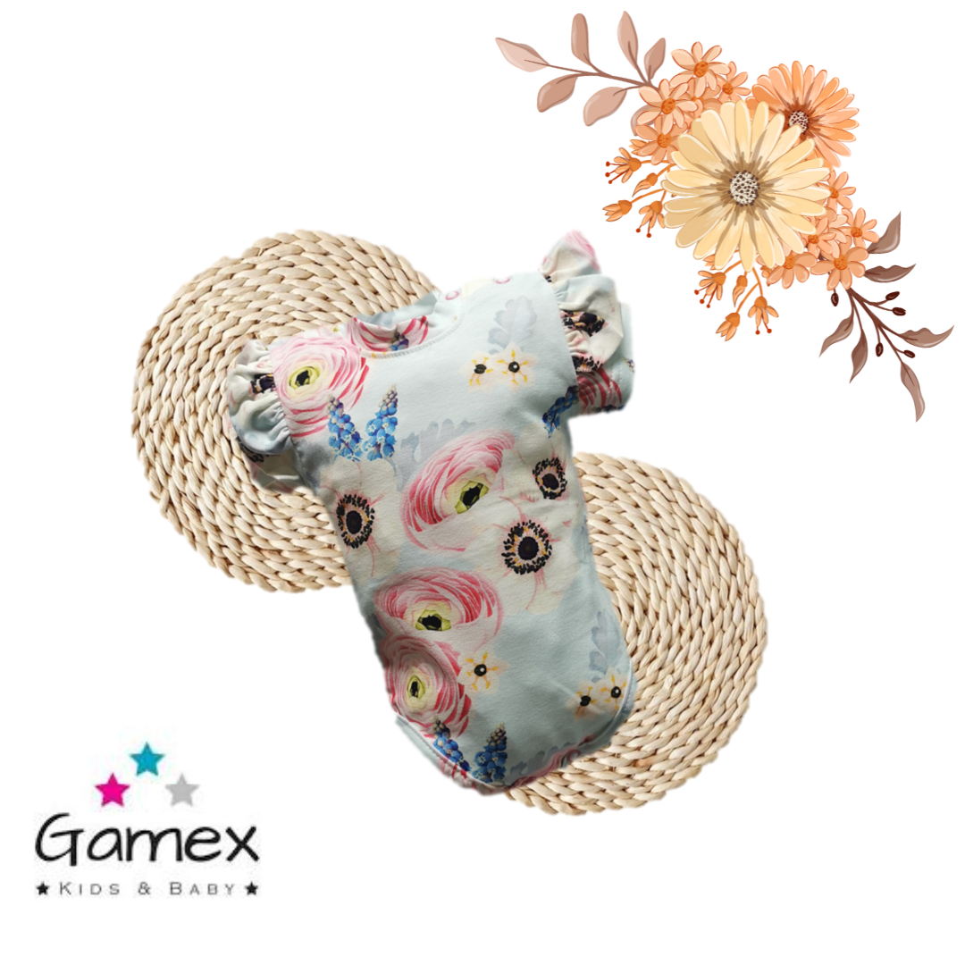 Body z motywem kolorowych kwiatów i falbankami na rękawkach . Skład: 95% bawełna , 5% elastan. Polski producent Gamex.