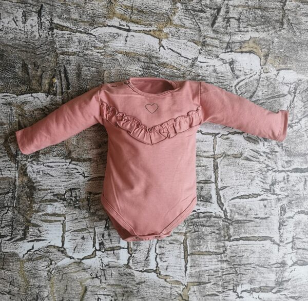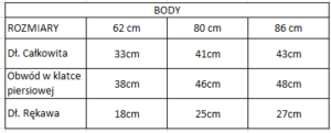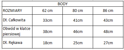 Body z motywem serduszka oraz falbanek . Na ramieniu zapinane na napkę co ułatwia ich zakładanie i zdejmowanie Skład: 95% bawełna, 5% elastan Polski producent Mrofi.