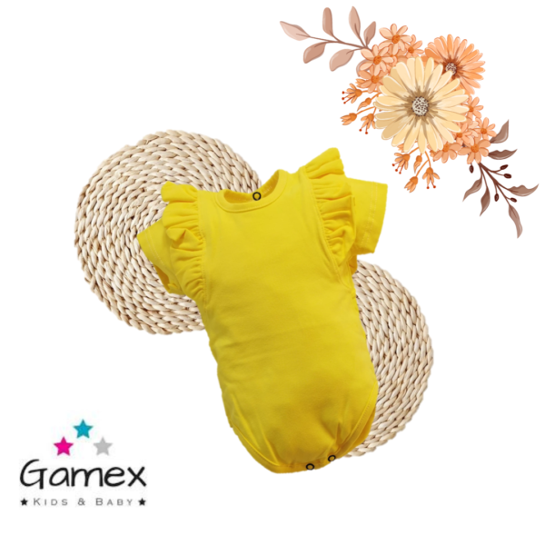 Body w kolorze żółtym i falbankami na rękawkach . Skład: 95% bawełna , 5% elastan. Polski producent Gamex.