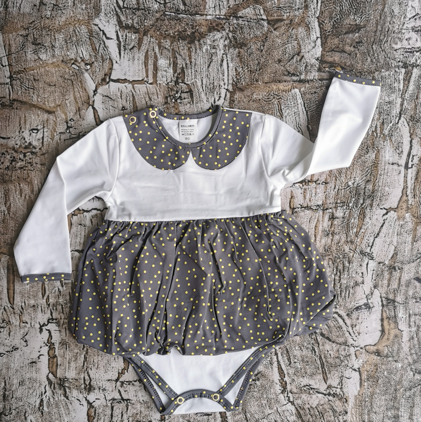 Elegancka body sukienka z motywem żółtych groszków. Na ramieniu zapinana na napki co ułatwia jej zakładanie i zdejmowanie. Skład: 95% bawełna, 5% elastan. Polski producent Mrofi.