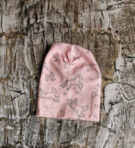 Czapka z motywem jednorożca, miękka i elastyczna. Skład 95% bawełna 5% elastan. Polski producent Mrofi.
