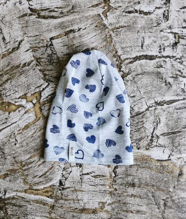 Czapka szara serca granat. Skład 95% bawełna, 5% elastan . Polski producent Mrofi.