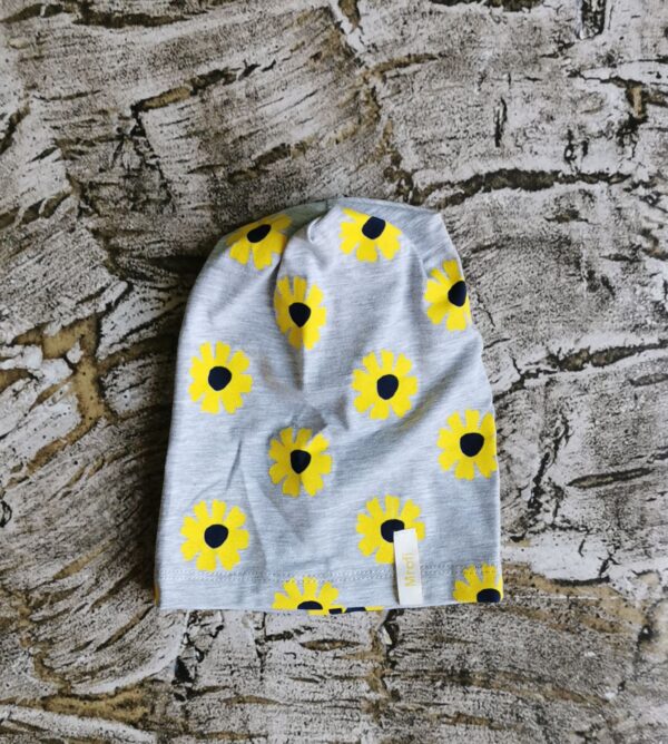 Czapka szara w żółte kwiaty . Skład 95% bawełna, 5% elastan . Polski producent Mrofi.