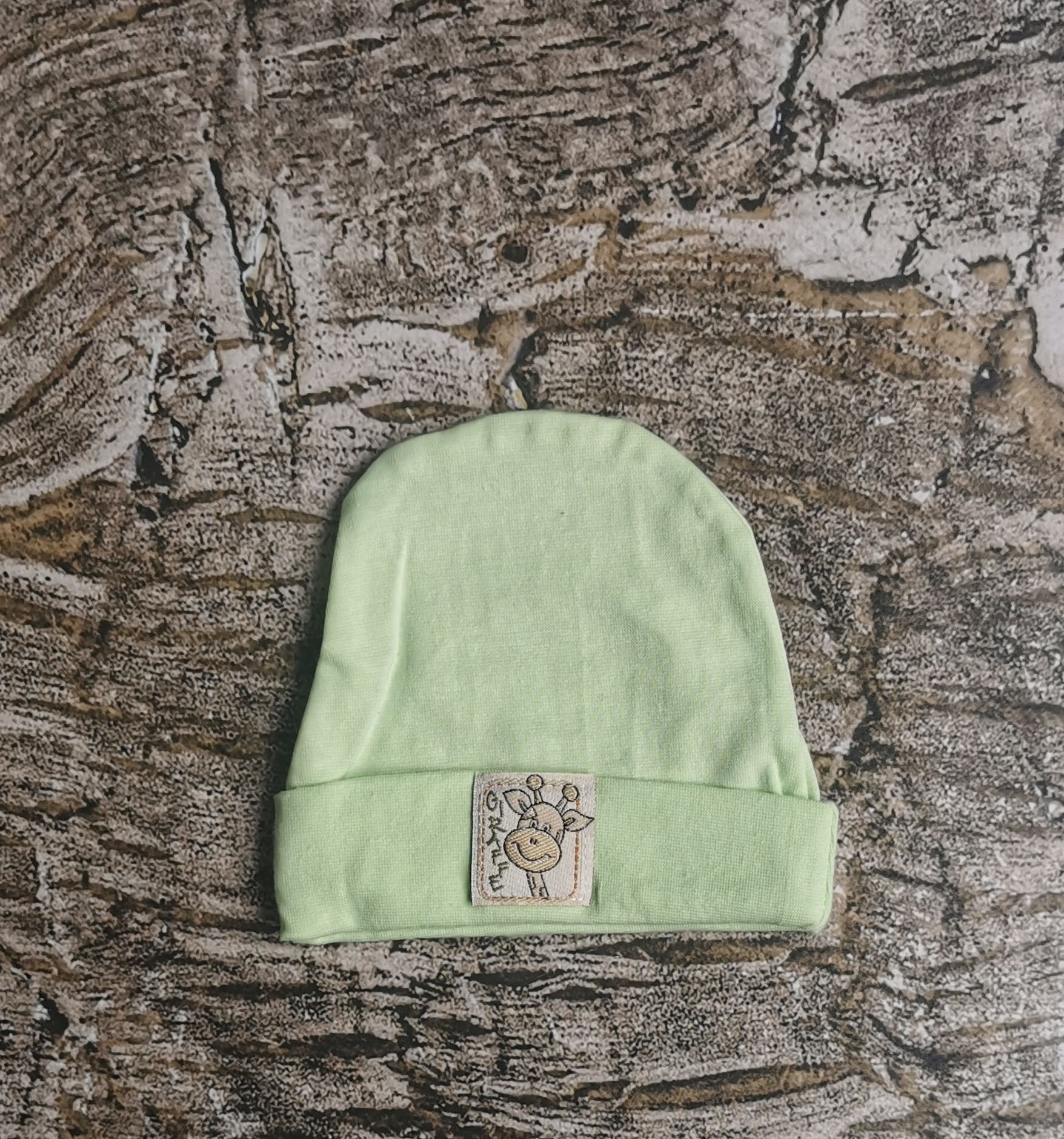 Zielona czapeczka z motywem żyrafy . Skład 95% bawełna, 5% elastan . Polski producent Mrofi.