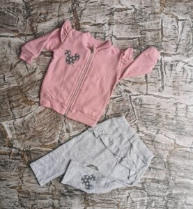 Dres z motywem myszki minnie . Miły w dotyku dresik, zapinany na zamek błyskawiczny (bezpieczny dla dziecka) . 95% bawełna 5% elastan Polski producent Mrofi.