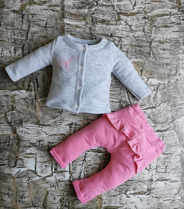 Dres szaro-różowy, z motywem motylka. Bluza zapinana na guziczki . Skład materiału: 95% bawełna oraz 5% poliester, spodnie z tyłu mają falbankę. Polski producent Mrofi.