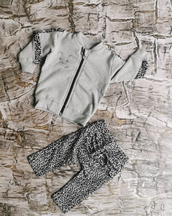 Dresik dla dziewczynki z bardzo modnym wzorem w panterke, spodenki z tyłu posiadają falbanki, bluza ma zamek błyskawiczny (bezpieczny dla dziecka) Skład materiału: 95% bawełna oraz 5% elastan. Polski producent Mrofi
