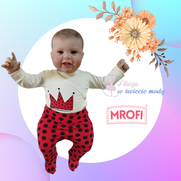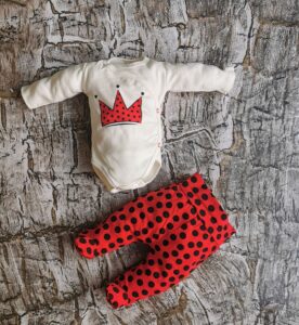 Kompleciki body i półśpiochy z motywem korony. Body kopertowe oraz półśpiochy bezuciskowe . Skład materiału: 95% bawełna , 5% elstan . Polski producent Mrofi.