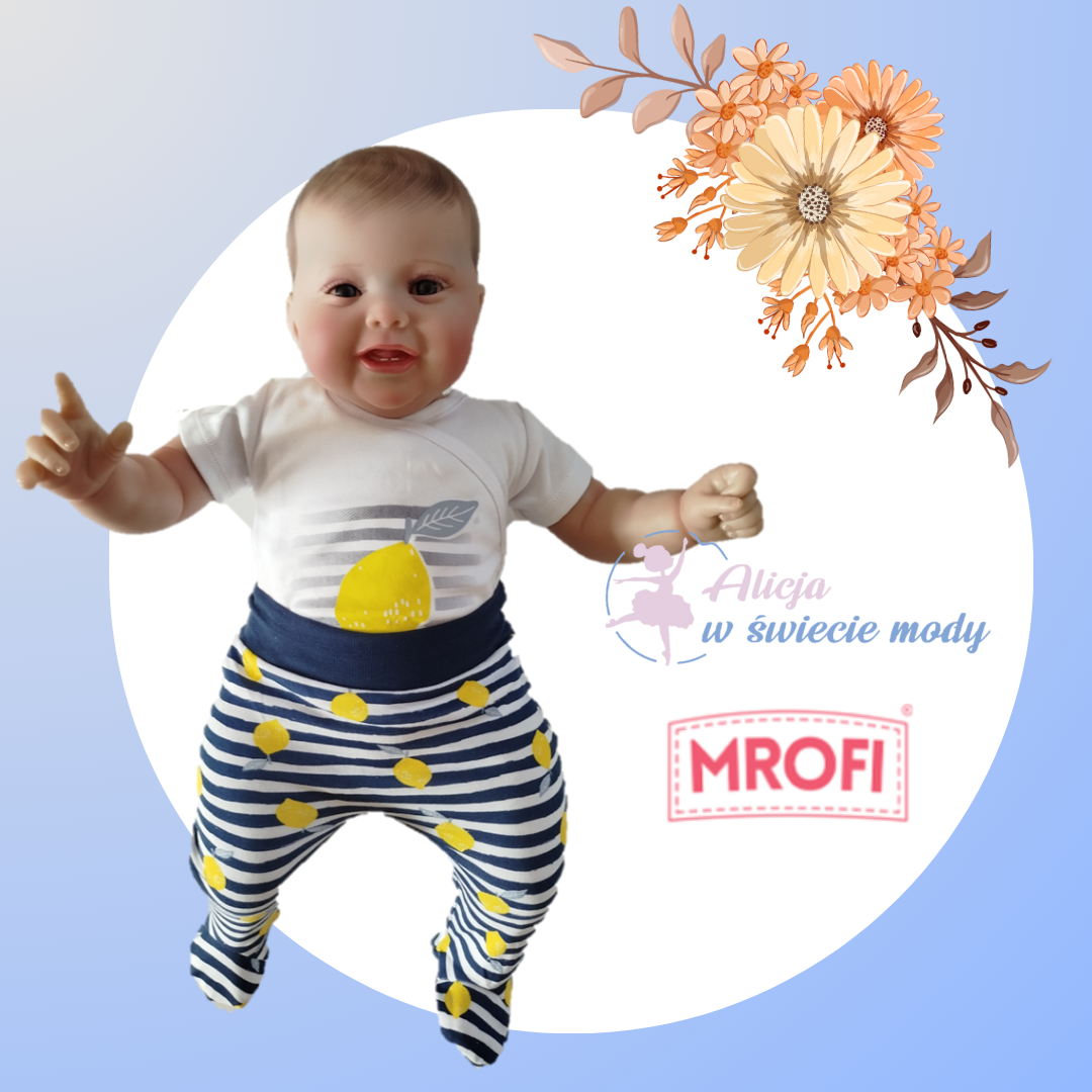 Kompleciki body i półśpiochy z motywem cytryn. W rozmiarze 56 i 62 cm body zapinane kopertowo, rozmiar 68 cm body zwykłe. Skład materiału: 100% bawełna . Polski producent Mrofi.
