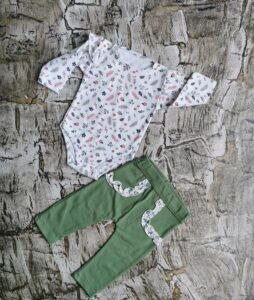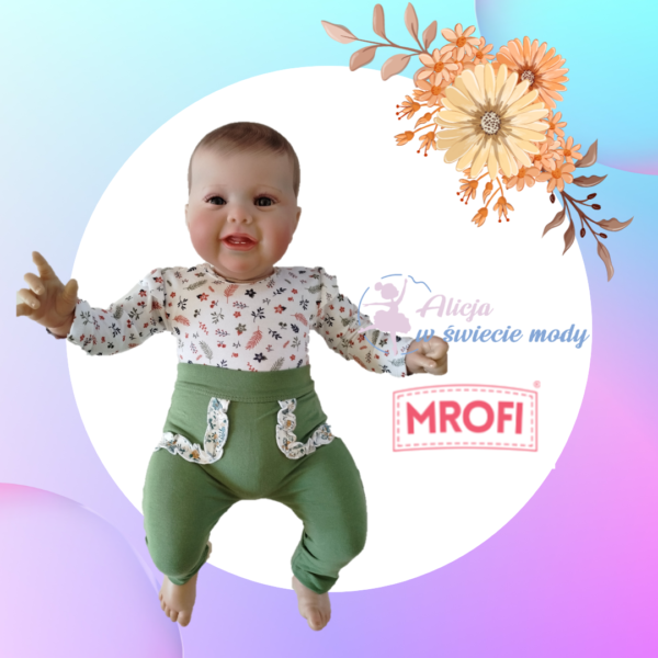 Śliczny komplecik z motywem gałązek. Body na ramieniu zapinane na napki co ułatwia ich zdejmowanie i zakładanie. Skład materiału: body 100% bawełna, spodnie 95% bawełna i 5% elastan . Polski producent Mrofi.