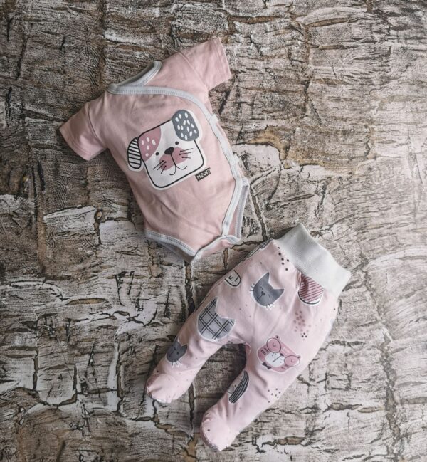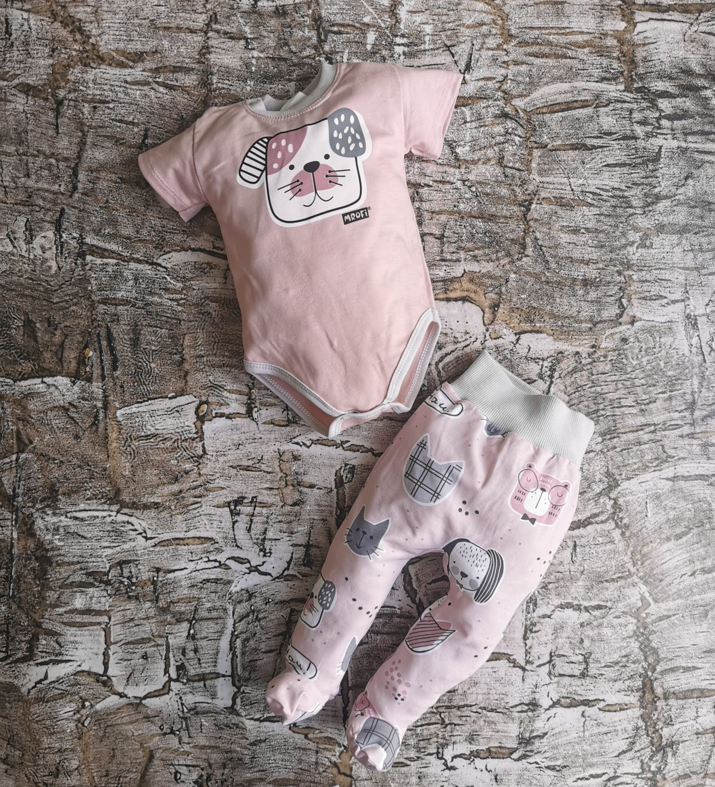 Komplecik z motywem piesków i kotków . Skład materiału: 95% bawełna, 5% poliester . W rozmiarze 56 i 62 cm body w formie koperty, rozmiar 68 i 74 cm body zwykłe. Polski producent Mrofi.