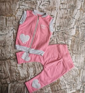 Różowy komplecik kamizelka i spodnie z motywem szarych serduszek. Skład 95% bawełna i 5% elastan. Polski producent Mrofi.