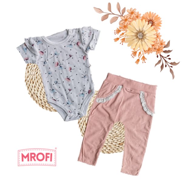 Miękki i wygodny komplecik dla dziewczynki. Body z falbankami i motywem kwiatów oraz spodnie z falbanką. Skład: Body 100% bawełna, spodnie 95% bawełna 5% elastan. Polski producent Mrofi.