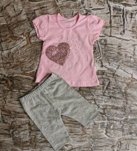 Miękki i wygodny komplecik z motywem serduszka. Skład 95% bawełna,5% lycra. Producent turecki.
