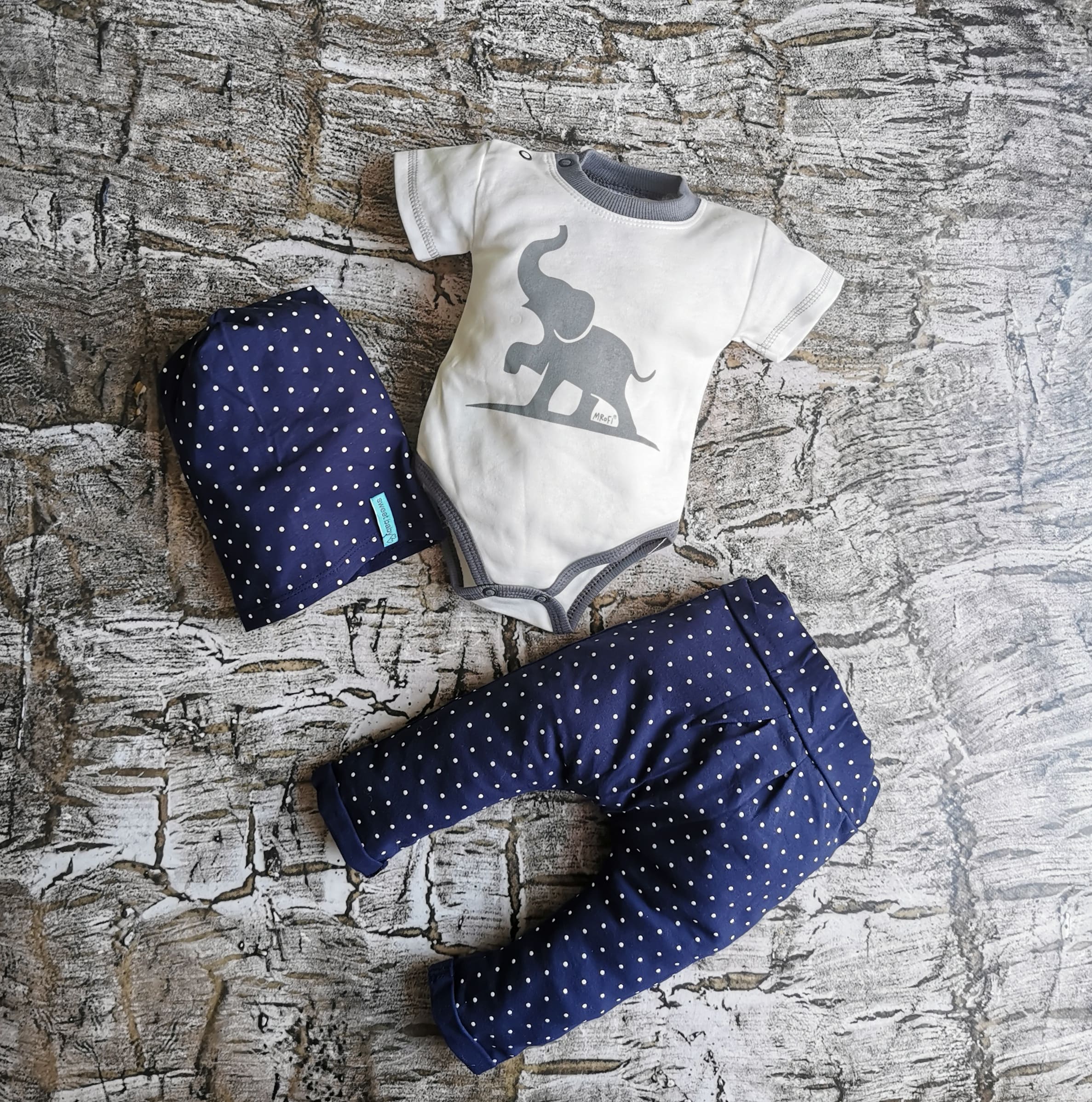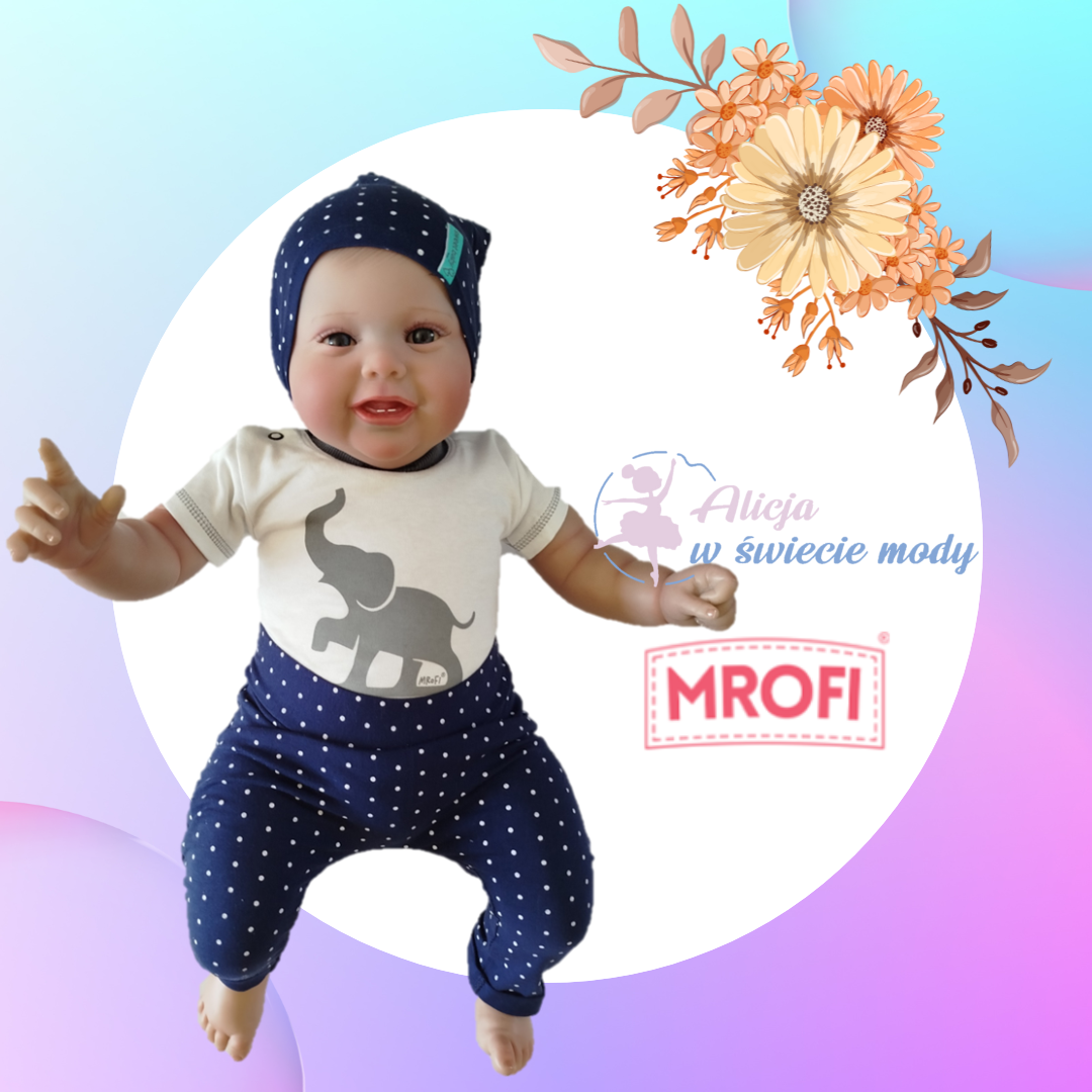 Miękki i wygodny komplecik body z motywem słonika , spodnie i czapka granatowe w kropeczki . Skład body 100% bawełna, 5% elastan. Spodnie 95% bawełna, 5% elastan. Polski producent Mrofi.