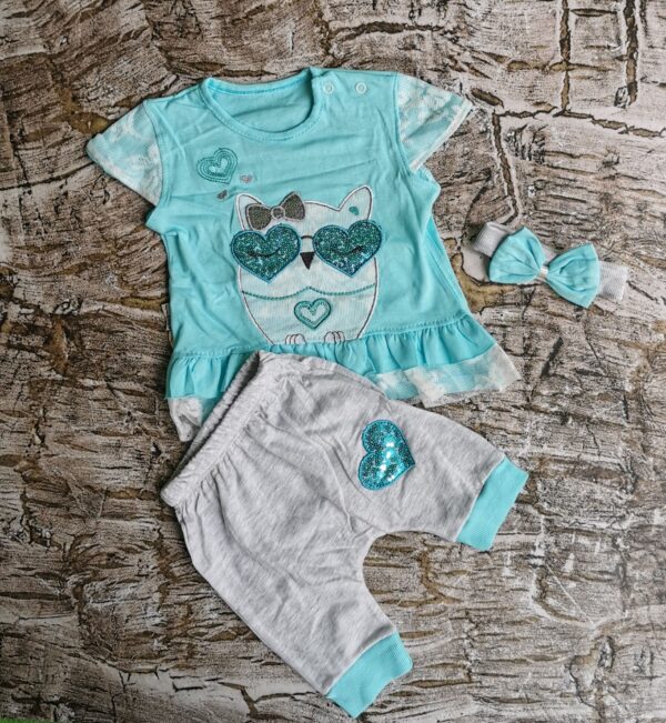 Miękki i wygodny komplecik z motywem sowy. Skład 80% bawełna, 20% poliester. Producent turecki.