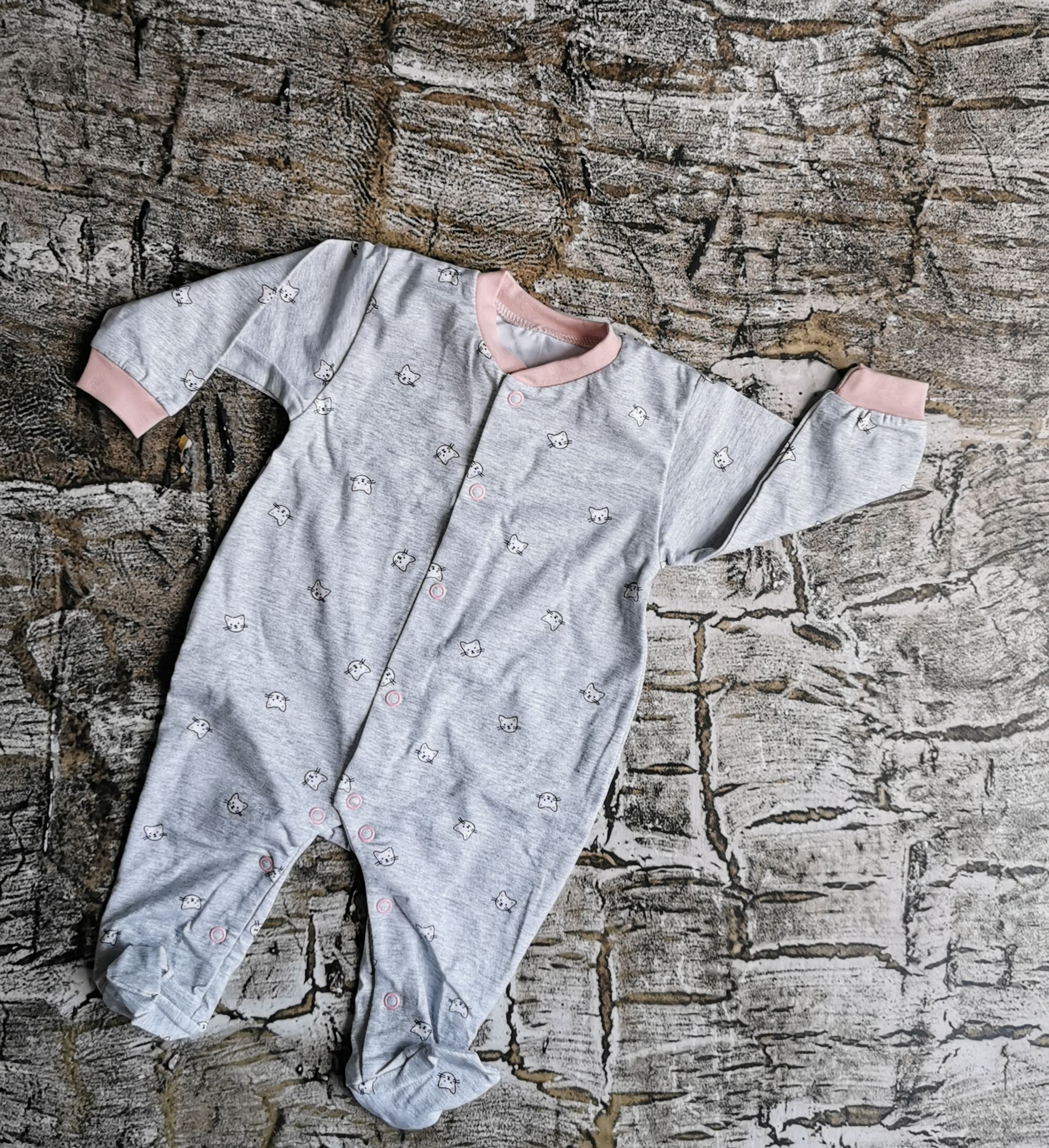 Pajacyk z motywem kotków. Miły w dotyku, 100% bawełna, polski producent Mrofi.