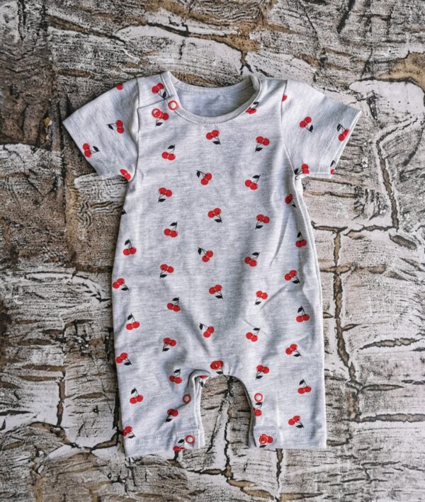 Rampers z motywem wisienek .Skład materiału: 95% bawełna, 5% elastan. Polski producent Mrofi.