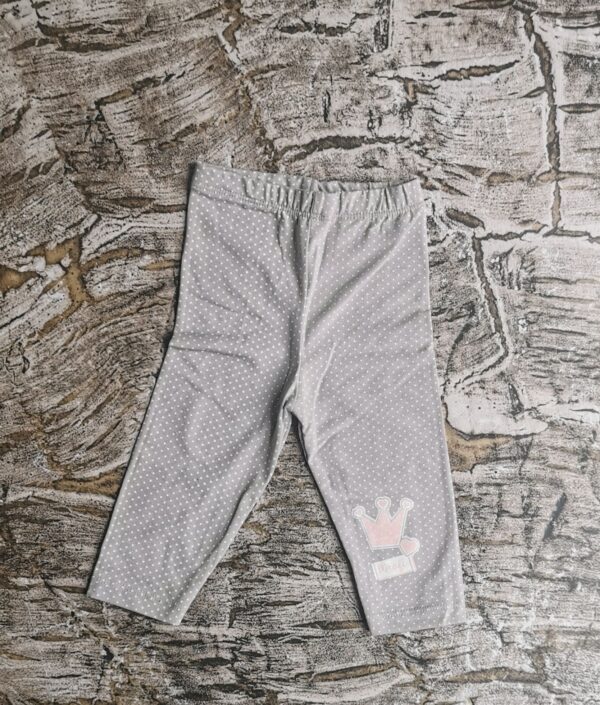 Miękkie i wygodne spodnie dla dziewczynki z motywem korony. Wykonane przez polskiego producenta Mrofi. Skład materiału: 95% bawełna, 5% elastan.