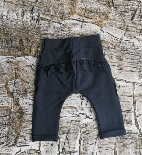 Miękkie i wygodne spodnie dla dziewczynki z modną falbanką z koronką znajdującą się z tyłu. Wykonane przez polskiego producenta Mrofi. Skład materiału: 95% bawełna oraz 5% elastan. Dodatek elastanu wpływa na wygodę noszenia, dlatego spodnie nie uciskają maluszka.