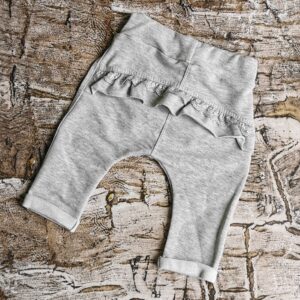 Miękkie i wygodne spodnie dla dziewczynki z modną falbanką z koronką znajdującą się z tyłu. Wykonane przez polskiego producenta Mrofi. Skład materiału: 95% bawełna oraz 5% elastan. Dodatek elastanu wpływa na wygodę noszenia, dlatego spodnie nie uciskają maluszka.