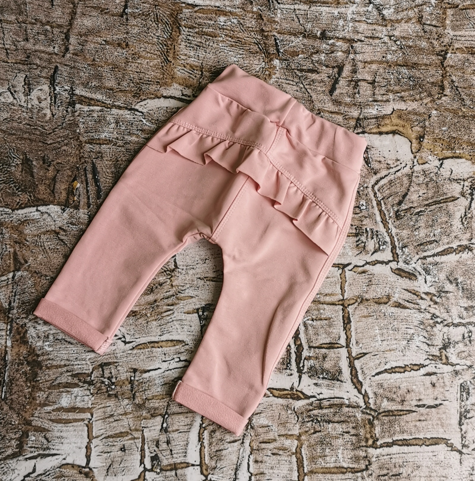 Spodnie Mia z falbanką pudrowy róż – Mrofi