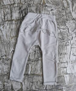 Miękkie i wygodne spodnie dla dziewczynki z modną falbanką znajdującą się z tyłu. Wykonane przez polskiego producenta Mrofi. Skład materiału: 95% bawełna oraz 5% elastan. Dodatek elastanu wpływa na wygodę noszenia, dlatego spodnie nie uciskają maluszka.