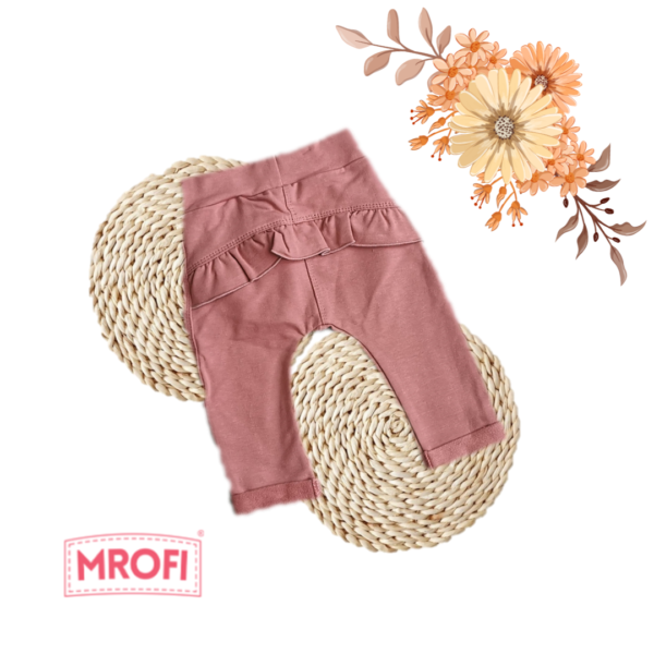 Miękkie i wygodne spodnie dla dziewczynki z modną falbanką znajdującą się z tyłu. Wykonane przez polskiego producenta Mrofi. Skład materiału: 95% bawełna oraz 5% elastan. Dodatek elastanu wpływa na wygodę noszenia, dlatego spodnie nie uciskają maluszka.