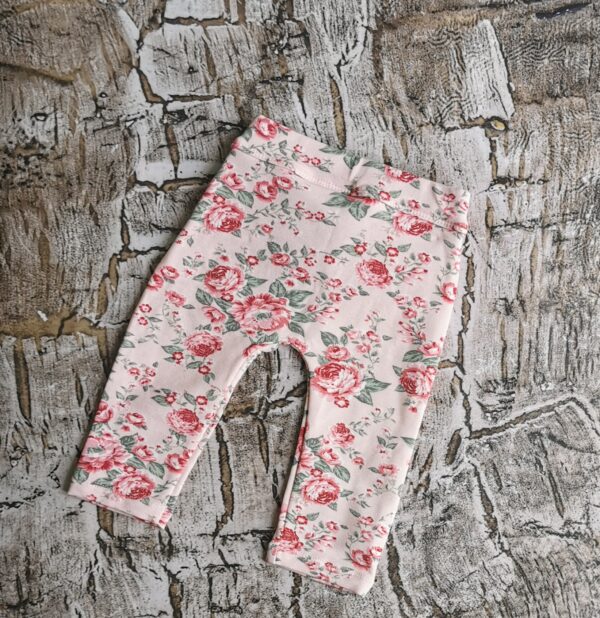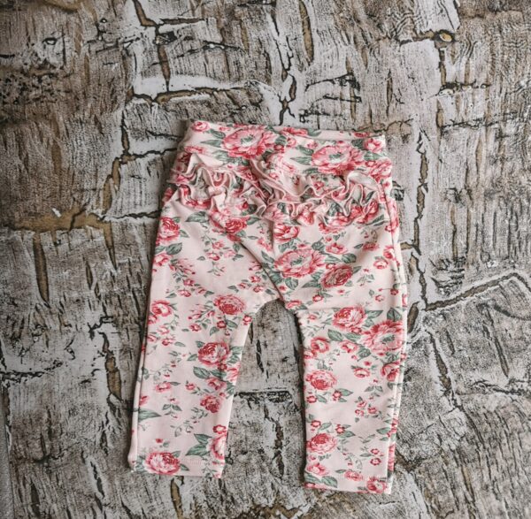Miękkie i wygodne spodnie dla dziewczynki, wzór kwiatowy z modną falbanką.  Wykonane przez polskiego producenta Mrofi. Skład materiału: 95% bawełna oraz 5% elastan. Dodatek elastanu wpływa na wygodę noszenia, dlatego spodnie nie uciskają maluszka.