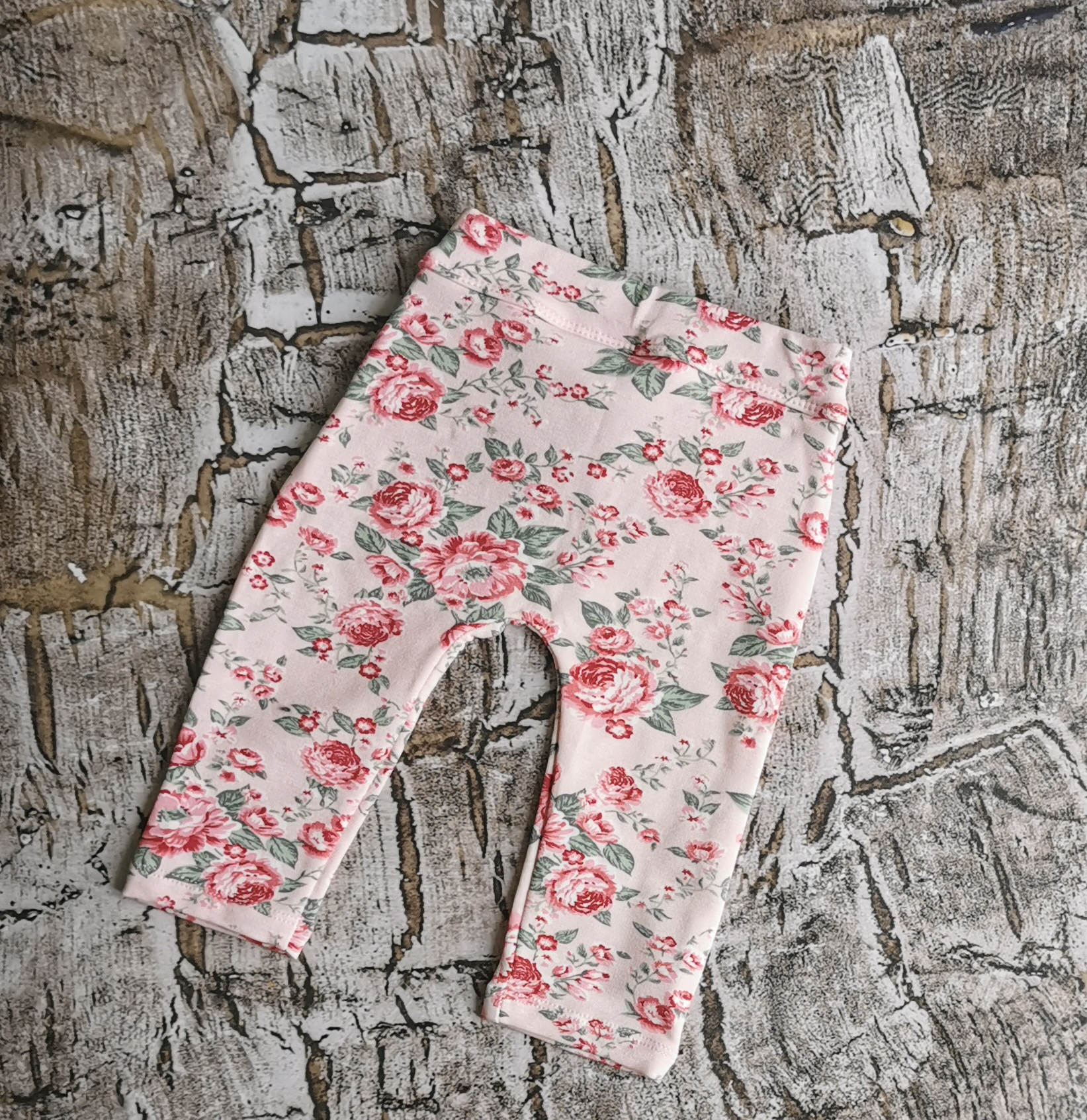 Miękkie i wygodne spodnie dla dziewczynki, wzór kwiatowy z modną falbanką.  Wykonane przez polskiego producenta Mrofi. Skład materiału: 95% bawełna oraz 5% elastan. Dodatek elastanu wpływa na wygodę noszenia, dlatego spodnie nie uciskają maluszka.