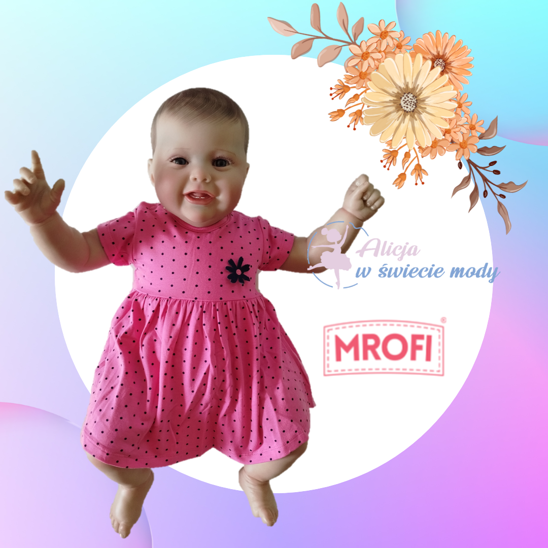 Różowa sukienka w groszki. Na ramieniu zapinana na napki co ułatwia jej zakładanie i zdejmowanie. Skład materiału: 95% bawełna, 5% elastan . Polski producent Mrofi.