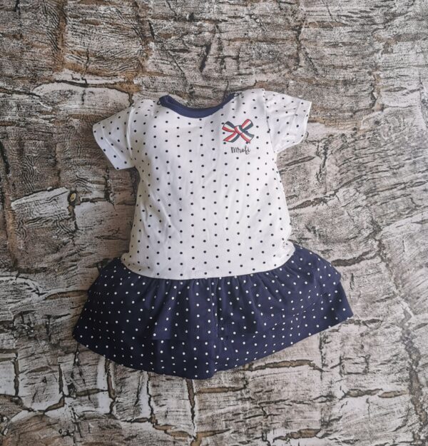Sukienka w groszki z kokardką. Skład materiału: 95% bawełna oraz 5% elastan. Polski producent Mrofi.