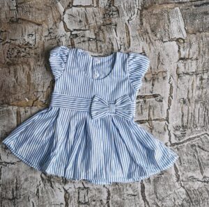 Sukienka w niebiesko białe paski. Z tyłu zapinana na napki co ułatwia jej zakładanie i zdejmowanie. Skład materiału: 100% bawełna . Polski producent Mrofi.