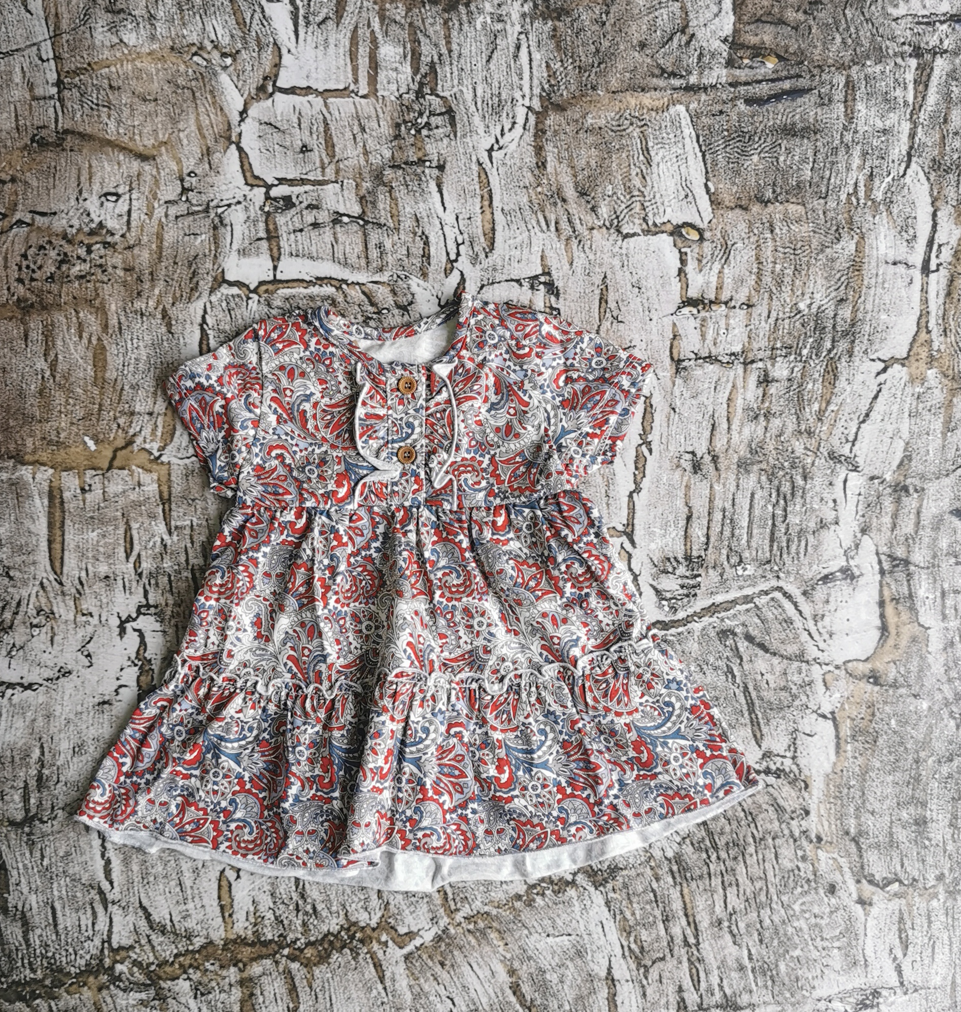 Sukienka w orientalne wzorki. Z przodu zapinana na guziczki co ułatwia jej zakładanie i zdejmowanie. Urocze falbanki podkreślają jej wyjątkowy styl. Skład materiału: 100% bawełna . Polski producent Mrofi.