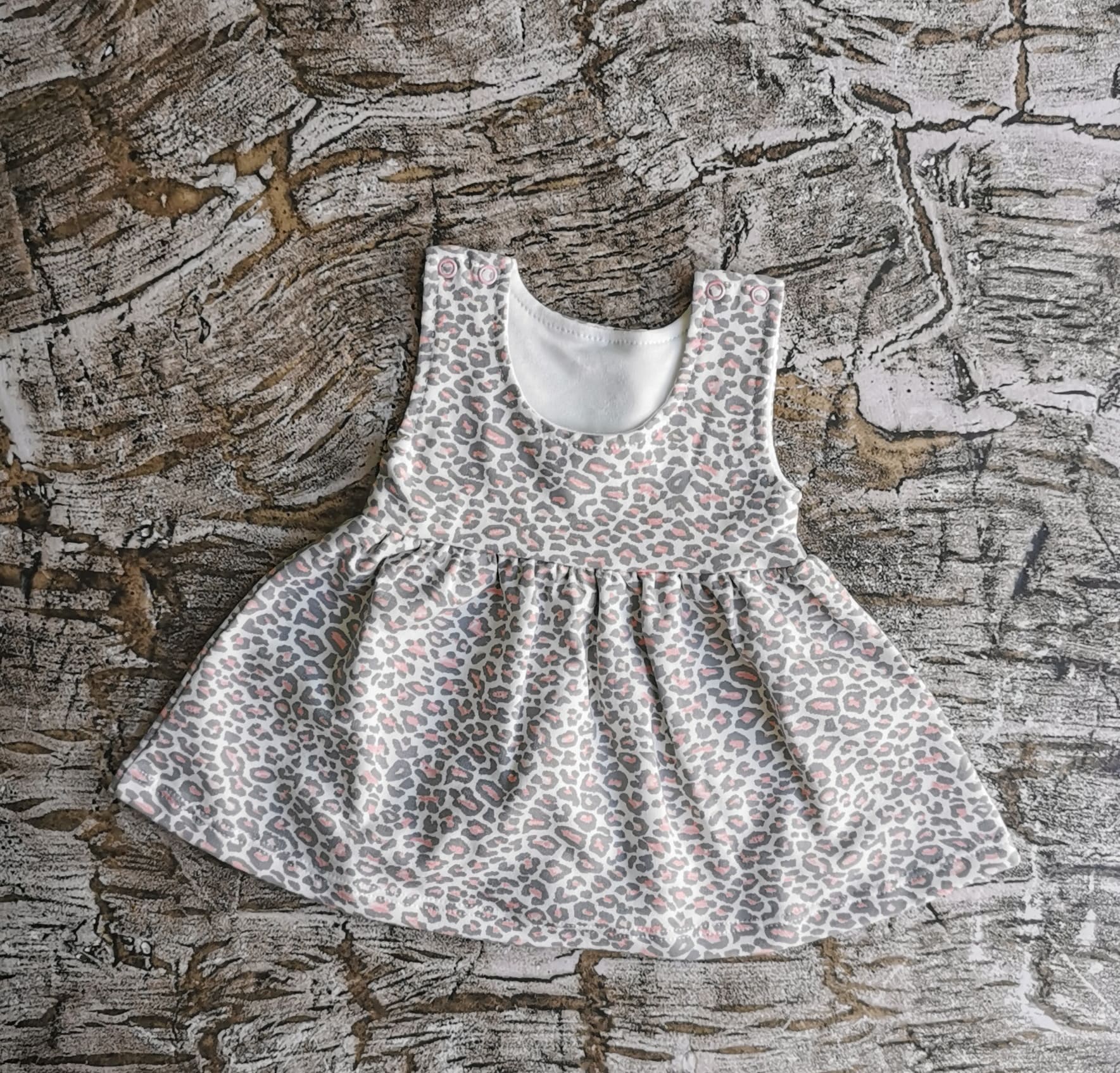 Śliczna sukieneczka z motywem w panterkę. Zapinana na ramionach. Skład materiału: 95 % bawełna oraz 5% elastan . Polski producent Mrofi.