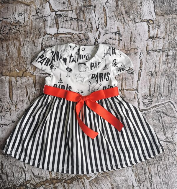 Sukienka z napisem paris oraz czarno białe paski. Z tyłu zapinana na napki co ułatwia jej zakładanie i zdejmowanie. Skład materiału: 100% bawełna . Polski producent Mrofi.