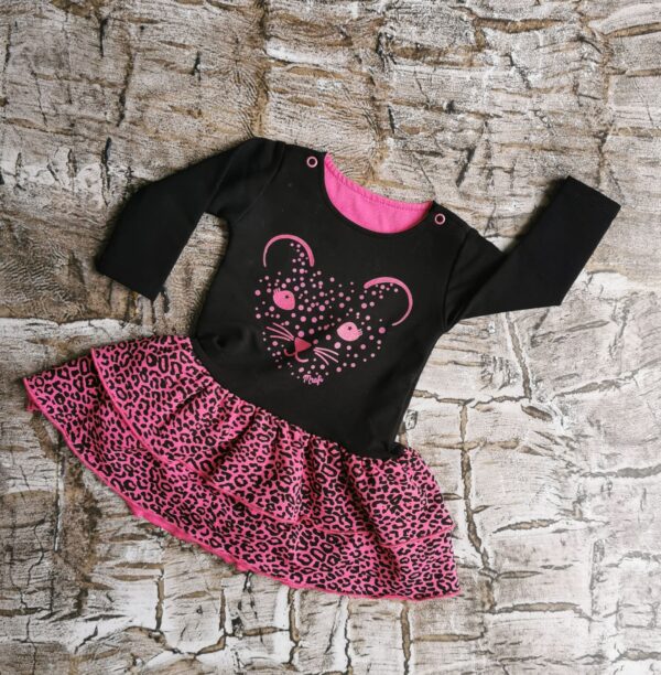 Sukienka z modnym wzorem panterki. Z prawej i lewej strony ramienia jest zapinana na bezniklowe napki, które nie uczulają. Skład materiału: 95% bawełna oraz 5% elastan. Polski producent Mrofi.