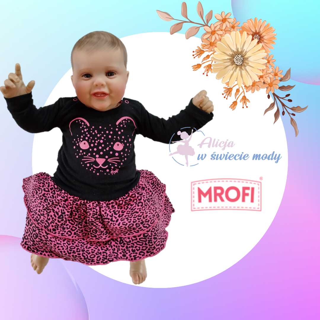 Sukienka z modnym wzorem panterki. Z prawej i lewej strony ramienia jest zapinana na bezniklowe napki, które nie uczulają. Skład materiału: 95% bawełna oraz 5% elastan. Polski producent Mrofi.