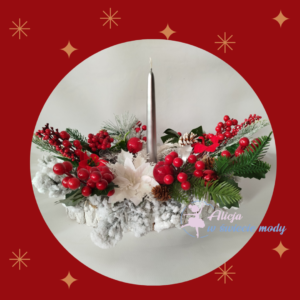 Stroik świąteczny wykonany na drewnianej podstawie. Zimowa dekoracja z ośnieżonymi elementami oraz kolorowe dodatki tj. gałązki iglaste zielone , kwiaty srebrne, czerwone i białe, czerwone jagody, szyszki oraz srebrna świeczka. Wymiary ok. 50×30 cm. Elegancka dekoracja, która nada twojemu pomieszczeniu świąteczny klimat. Stroik można postawić np. na stole, komodzie bądź parapecie. Artykuły florystyczne nie obejmują wysyłki za pobraniem .