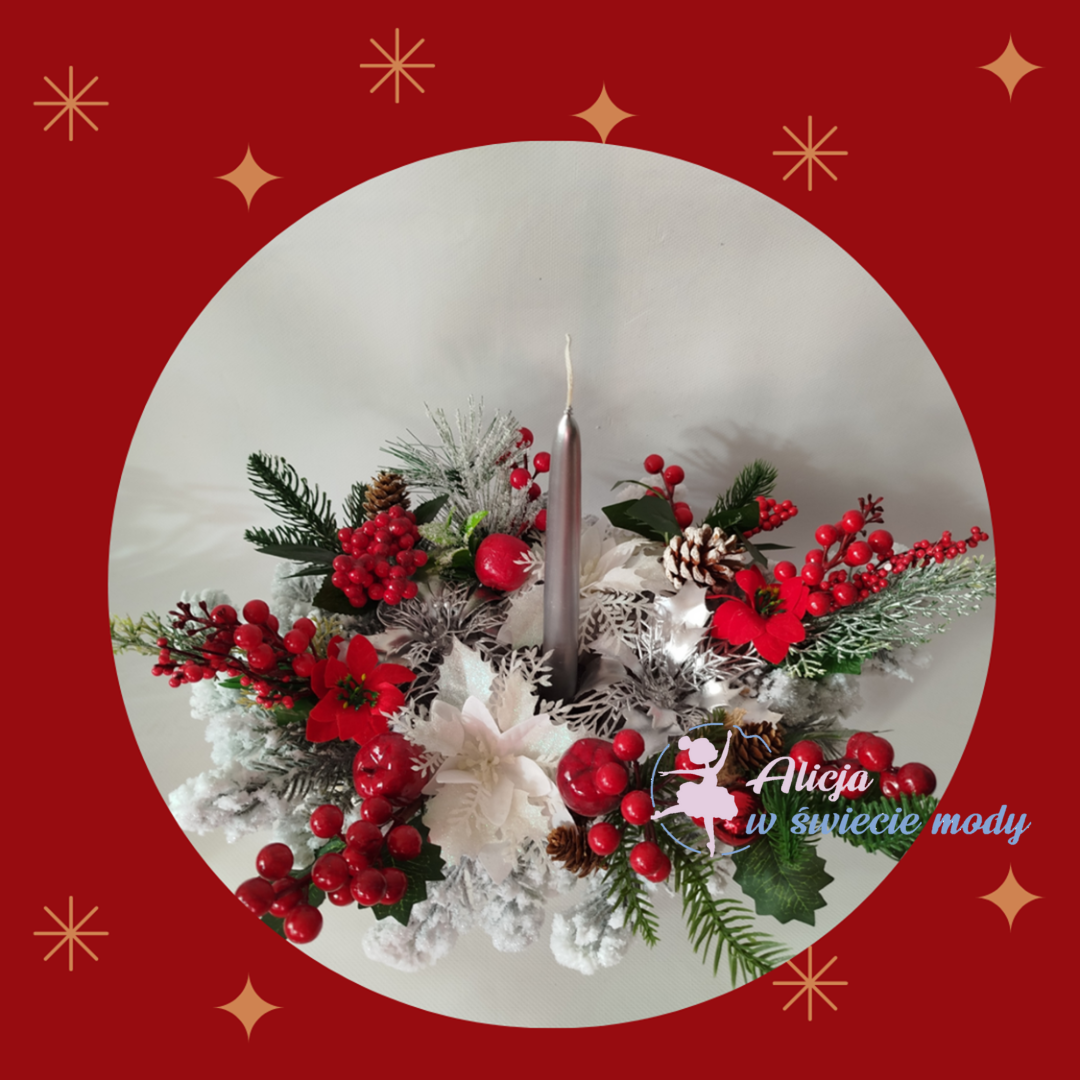 Stroik świąteczny wykonany na drewnianej podstawie. Zimowa dekoracja z ośnieżonymi elementami oraz kolorowe dodatki tj. gałązki iglaste zielone , kwiaty srebrne, czerwone i białe, czerwone jagody, szyszki oraz srebrna świeczka. Wymiary ok. 50×30 cm. Elegancka dekoracja, która nada twojemu pomieszczeniu świąteczny klimat. Stroik można postawić np. na stole, komodzie bądź parapecie. Artykuły florystyczne nie obejmują wysyłki za pobraniem .