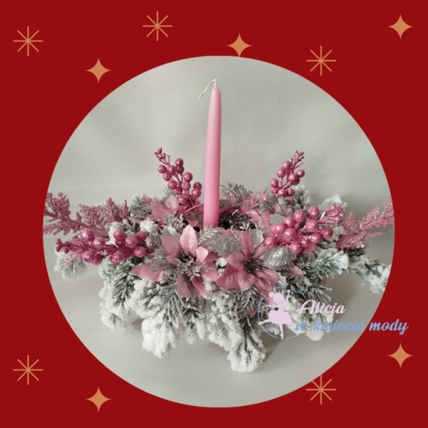Stroik świąteczny wykonany na drewnianej podstawie. Zimowa dekoracja z ośnieżonymi elementami oraz różowe dodatki tj. różowe brokatowe gałązki , różowo srebrne kwiaty oraz różowa świeczka. Wymiary ok. 50×30 cm. Elegancka dekoracja, która nada twojemu pomieszczeniu świąteczny klimat. Stroik można postawić np. na stole, komodzie bądź parapecie. Artykuły florystyczne nie obejmują wysyłki za pobraniem .