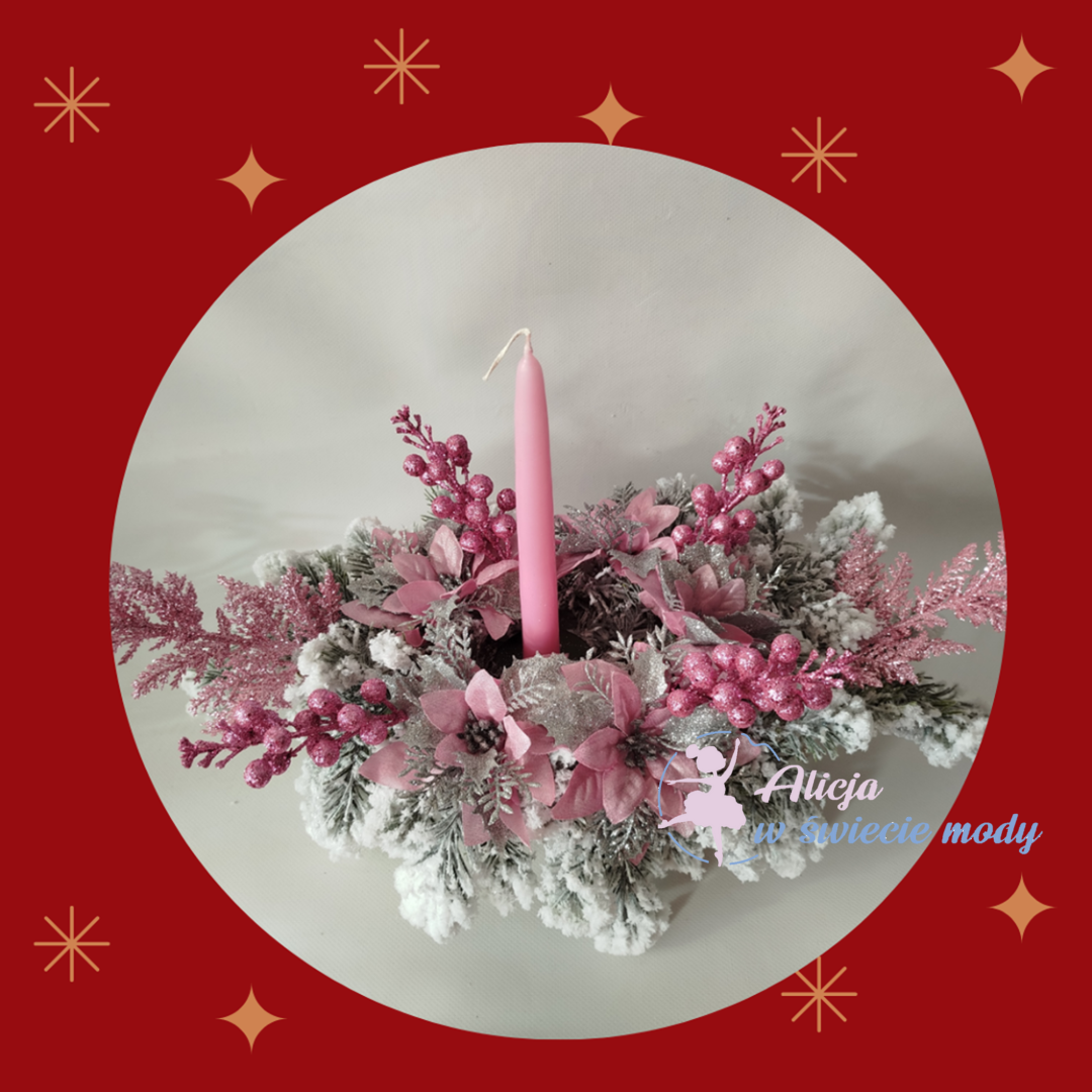 Stroik świąteczny wykonany na drewnianej podstawie. Zimowa dekoracja z ośnieżonymi elementami oraz różowe dodatki tj. różowe brokatowe gałązki , różowo srebrne kwiaty oraz różowa świeczka. Wymiary ok. 50×30 cm. Elegancka dekoracja, która nada twojemu pomieszczeniu świąteczny klimat. Stroik można postawić np. na stole, komodzie bądź parapecie. Artykuły florystyczne nie obejmują wysyłki za pobraniem .