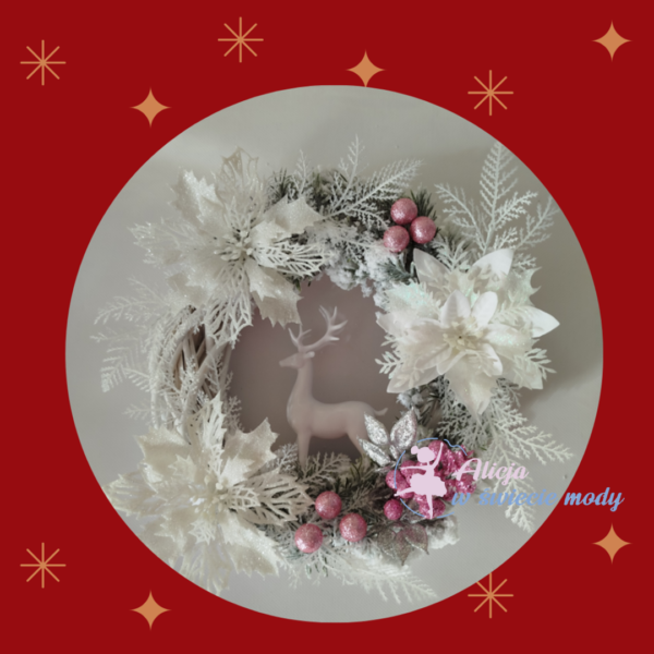 Wianek glamour z ośnieżonych sztucznych gałązek igliwia, z dodatkami ozdobnymi tj. dekoracyjne błyszczące kulki piankowe, białe kwiaty, białe gałązki , srebrne listki oraz biały renifer. Całość wykonana własnoręcznie. Wymiary ok. 30×30 cm. Artykuły florystyczne nie obejmują wysyłki za pobraniem .